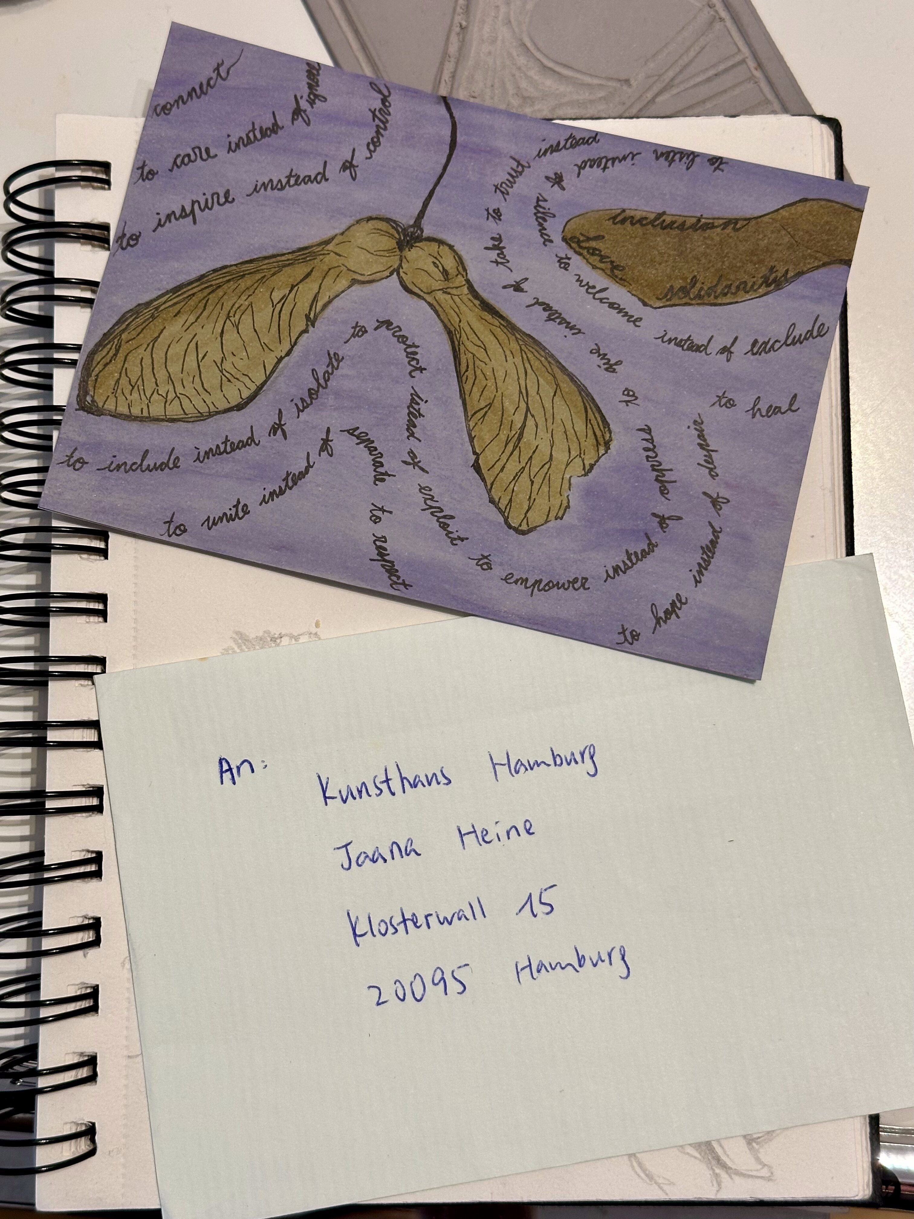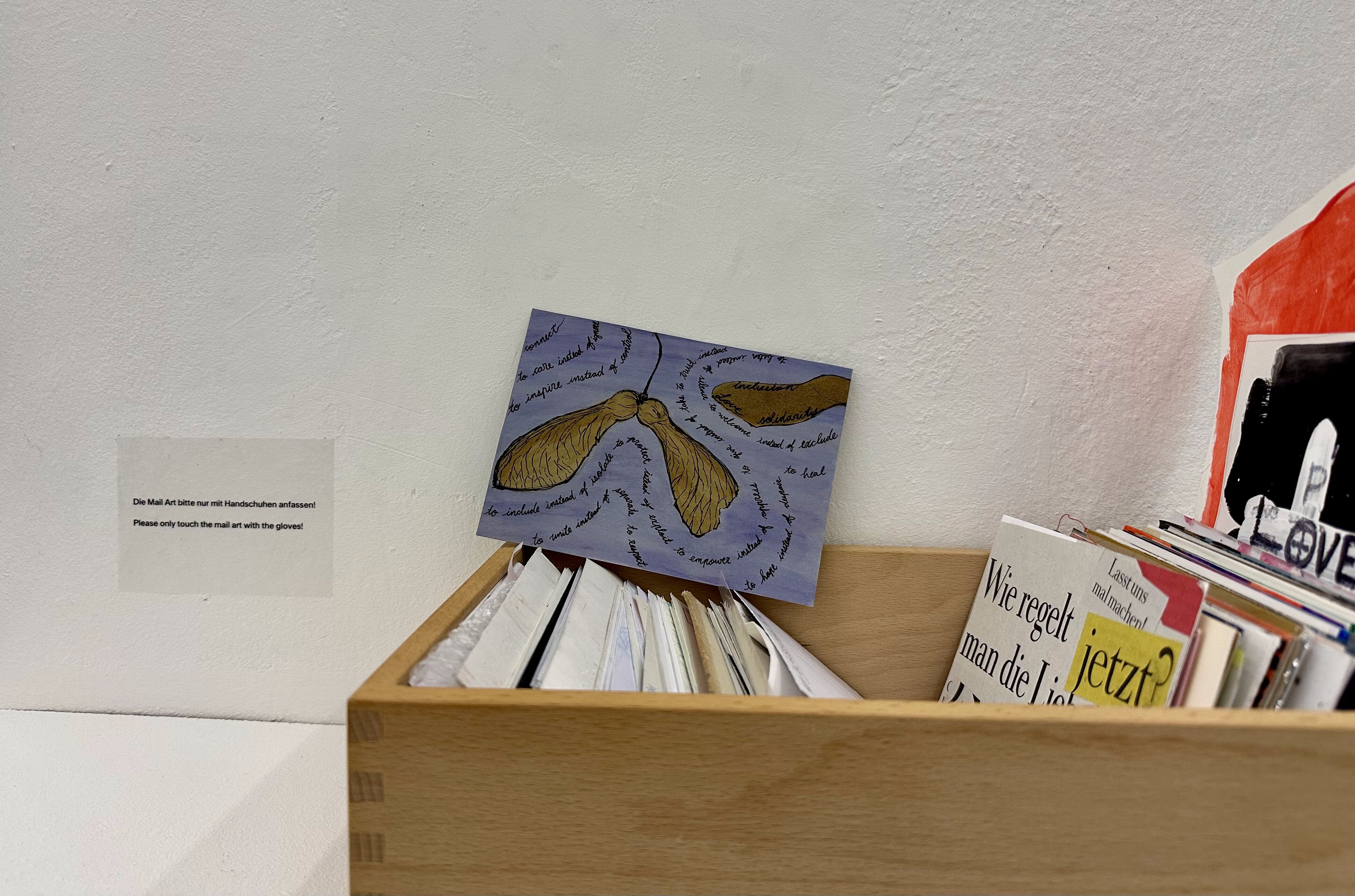 By posing the central question, ‘What are politics of love?’, artists both established and emerging were invited to participate by creating a unique mail-art piece in postcard format, sent through the postal system to the Kunsthaus Hamburg. These tangible contributions were available for viewing at the Kunsthaus during the exhibition period (30.11.2024-02.02.2025).