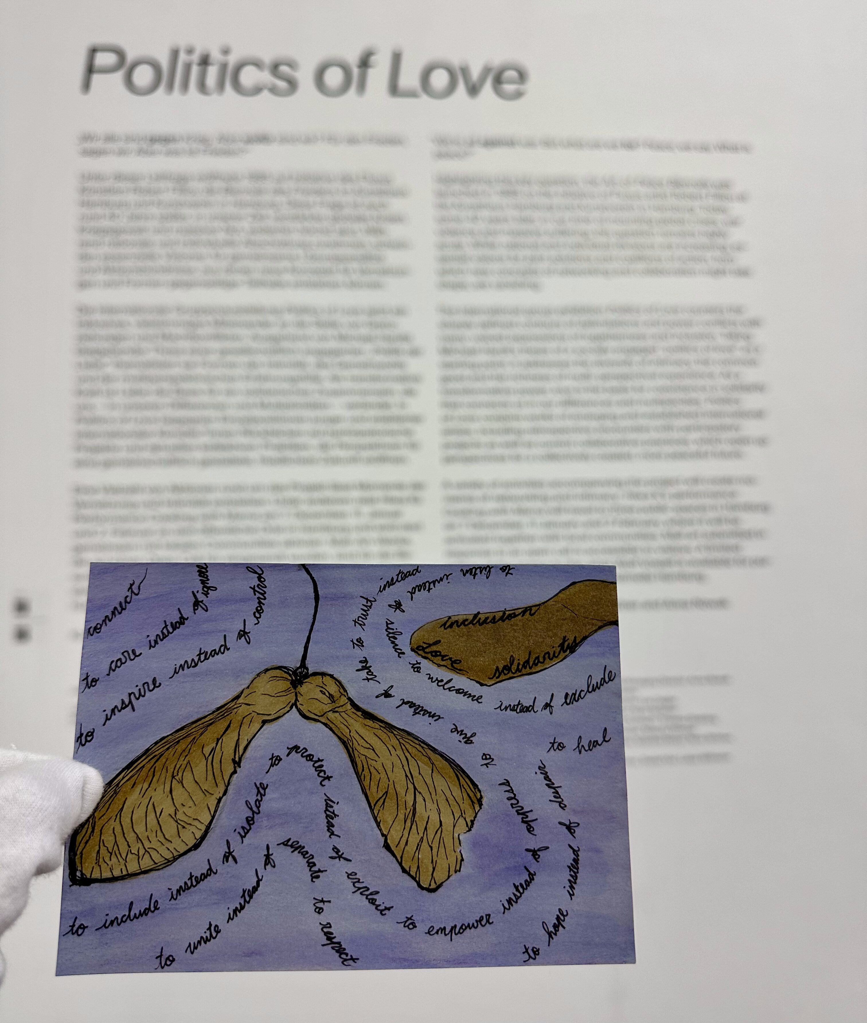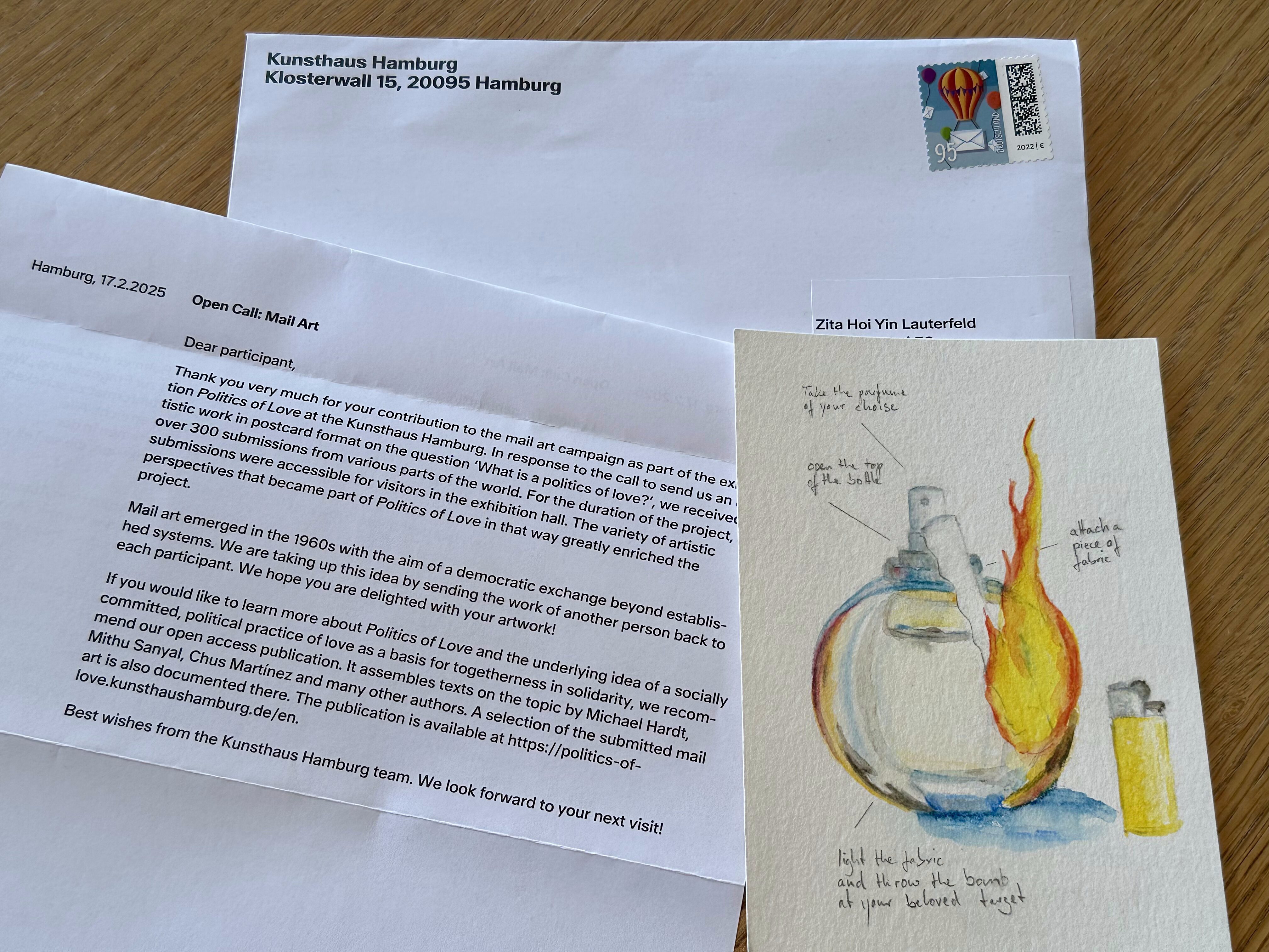 Rising as One, Zita Hoi Yin Lauterfeld, 2024, watercolor and ink on paper. Kunsthaus Hamburg ‘Politics of Love’ exhibition Open Mail Art (Photo private)
